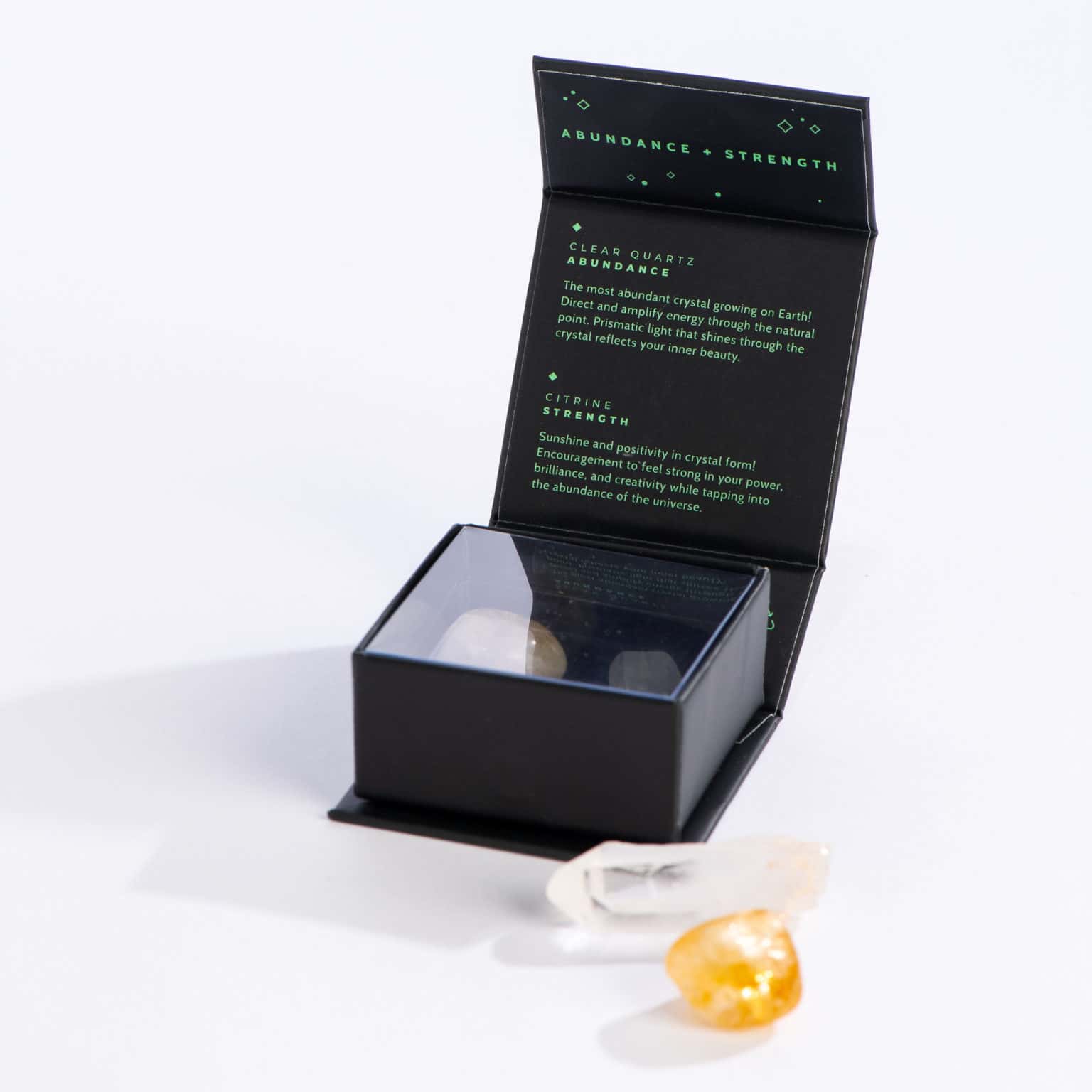 Unlock the powerful energies of abundance and strength with our CRYSTAL MAGIC collection, featuring the dynamic duo of clear quartz and citrine. Crystals have been cherished for centuries in holistic healing and self-care practices, and this curated set brings together the unique properties and positive energy of these remarkable stones. Venture on with the support of the cosmos and let these crystals illuminate your path.